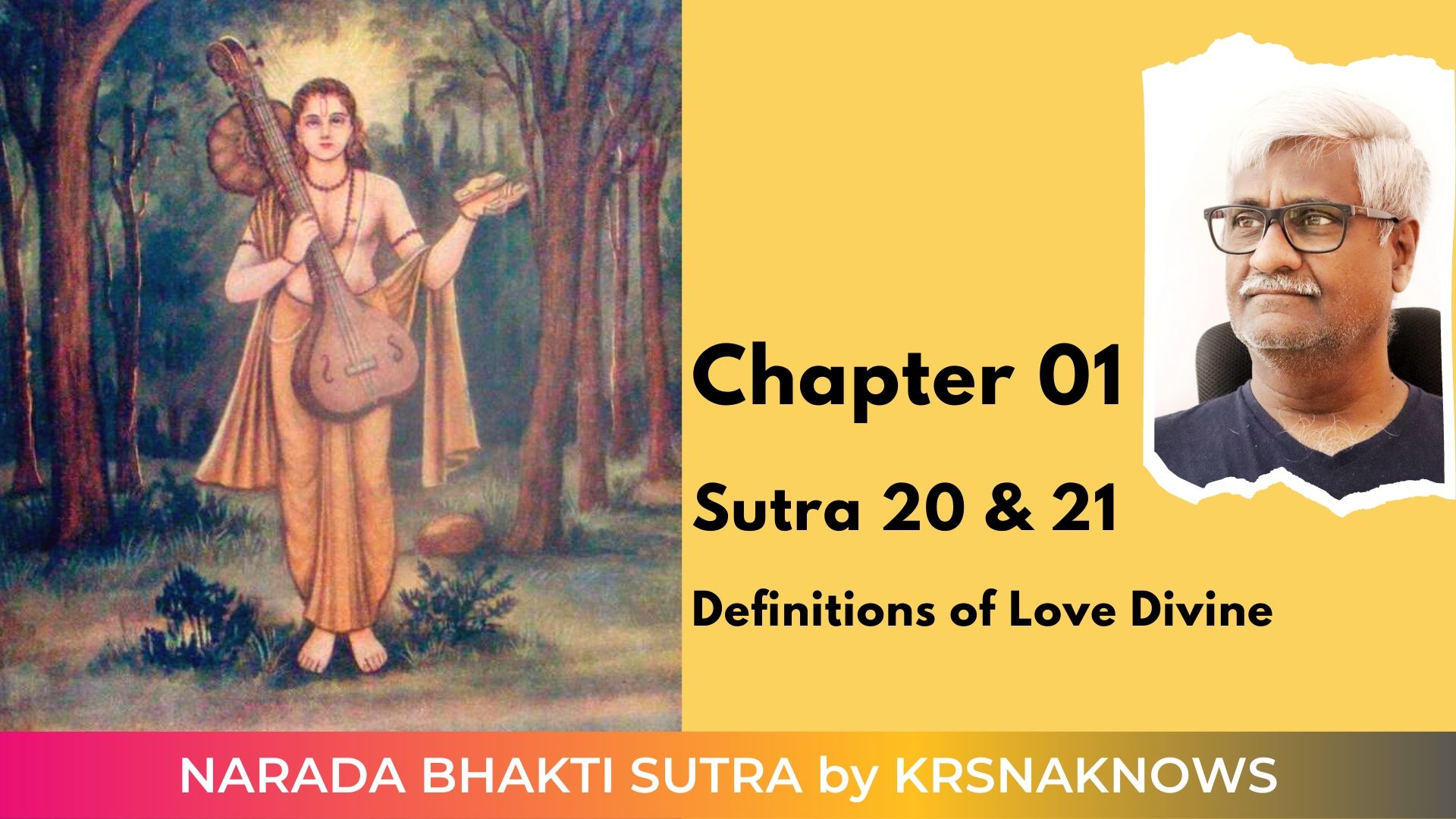 In this discourse Our Spiritual Master KrsnaKnows expounds the Bhakti Yoga Sutras (Path of Love & Devotion) of Devrishi Naradmuni. Narada Bhakti Sutra Chapter 01 – Bhakti – Love Divine – Uniqueness of Love Divine from Sutra 20 to 21.