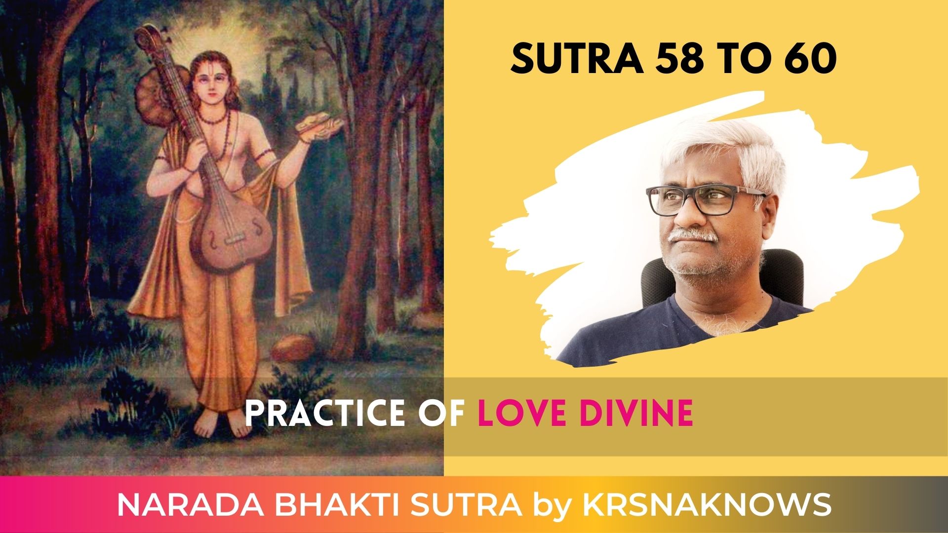 In this discourse Our Spiritual Master KrsnaKnows expounds the Bhakti Yoga Sutras (Path of Love & Devotion) of Devrishi Naradmuni. Narada Bhakti Sutra Chapter 06 – Narada’s Aphorisms on Love Divine – Practice of Love Divine – Easy to Practice from Sutra 58 to 60.