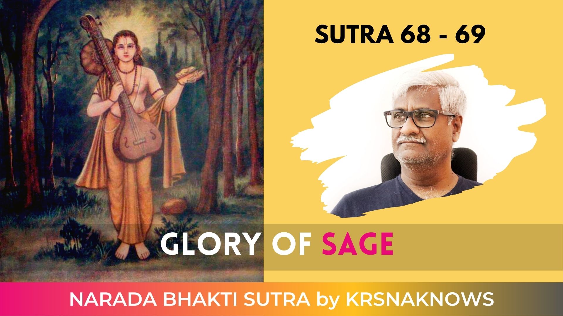 In this discourse Our Spiritual Master KrsnaKnows expounds the Bhakti Yoga Sutras (Path of Love & Devotion) of Devrishi Naradmuni. Narada Bhakti Sutra Chapter 07 – Narada’s Aphorisms on Love Divine – Glory of Sage from Sutra 68 to 69.