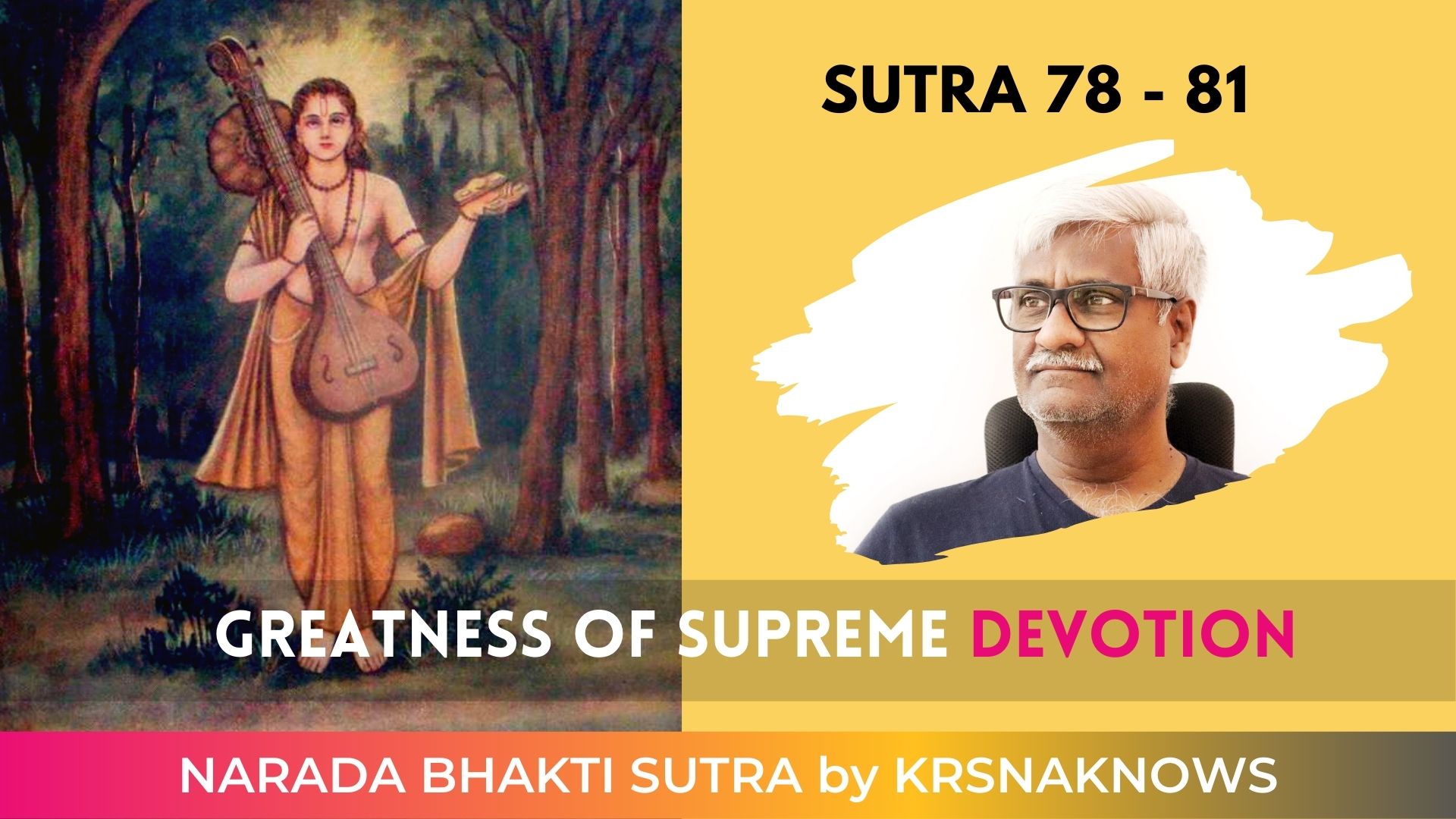 In this discourse, Our Spiritual Master KrsnaKnows expounds the Bhakti Yoga Sutras (Path of Love & Devotion) of Devrishi Naradmuni. Narada Bhakti Sutra – Narada’s Aphorisms on Love Divine – Chapter 08 Sutra 78 to 79 – Cultivate Devotion and Chapter 09 Sutra 80 to 81 – Greatness of Supreme Love.